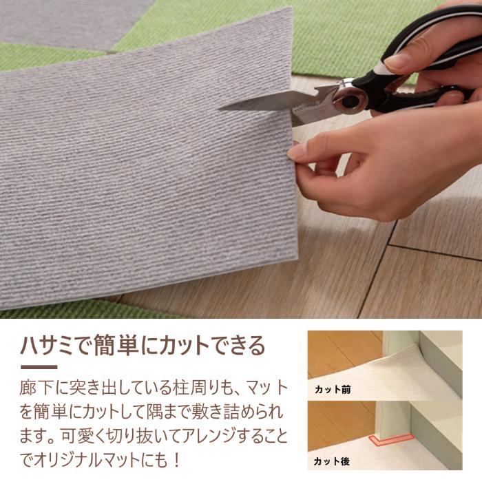 吸着式、置くだけ。接着剤などは一切いりません。さらにはさみを使って簡単にカスタマイズができ、部屋の隅や壁際などの場所でもぴったり敷き詰めることができます。様々な色バリエーションがあり、ご自身の好みに合わせて自由に組み合わせましょう。